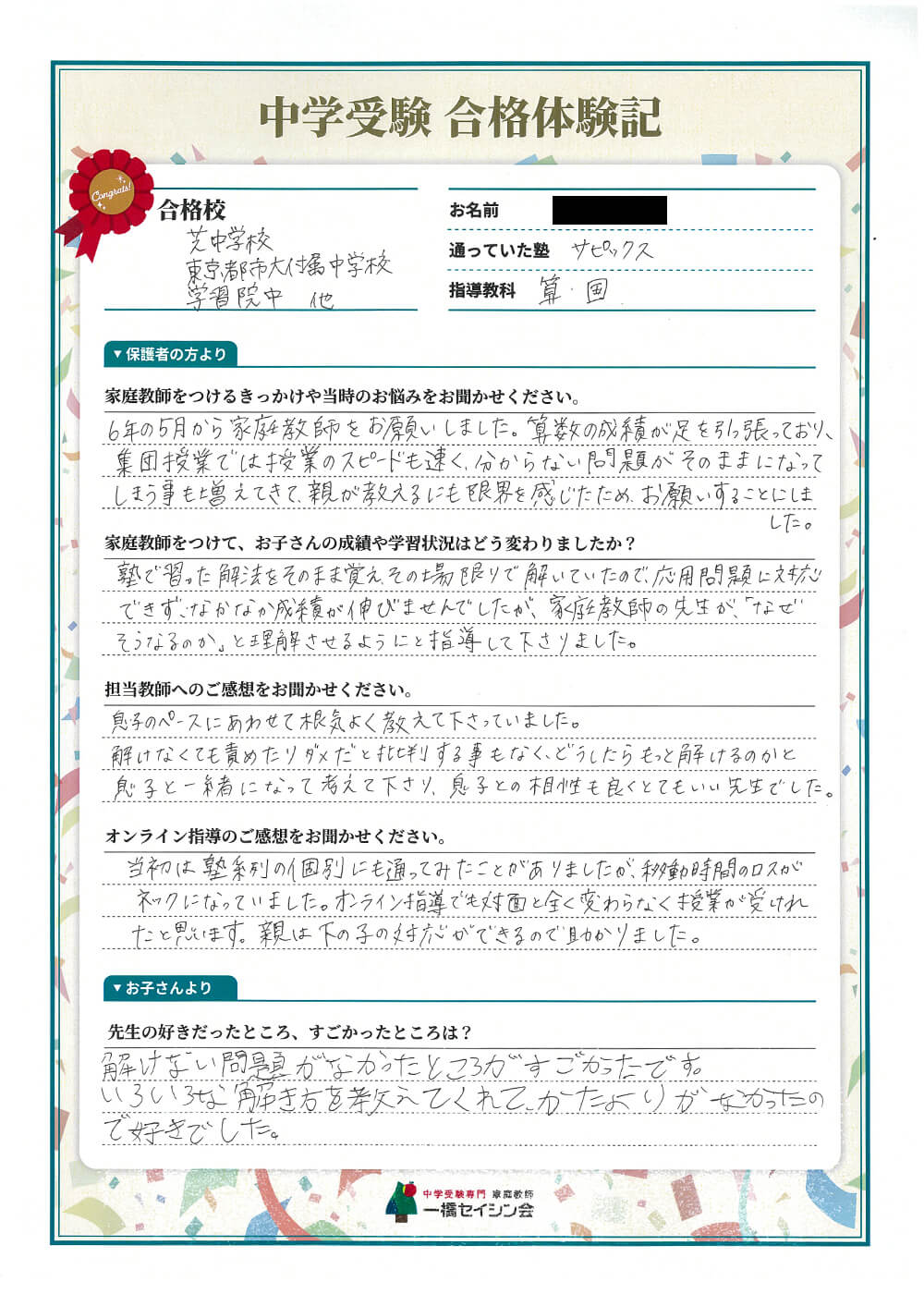 「4科目プロ講師の指導を受けて巣鴨に合格!」