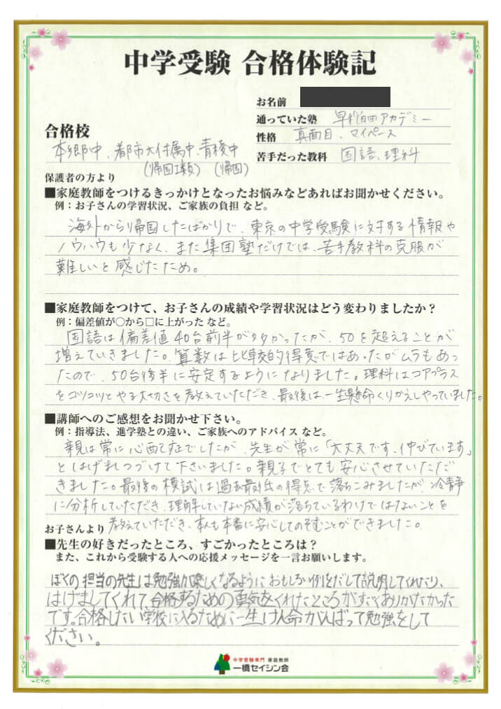 「4科の偏差値50.5から本郷に合格!」
